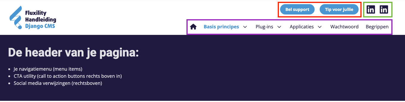 Paarse vak: navigatiemenu > alle titels van de pagina's